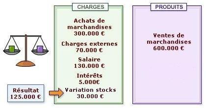C'est le compte de résultat qui va fournir cette vision dynamique explicitant la formation du résultat. La formation du résultat positif (profit) de notre exemple s'explique par le déséquilibre entre les charges (475 K€) et les produits (600 K€).
