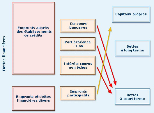 Dans le poste Emprunts et dettes financières divers, la présence éventuelle d'emprunts participatifs doit être détectée (bas de bilan) et leur montant reclassé dans les fonds propres.