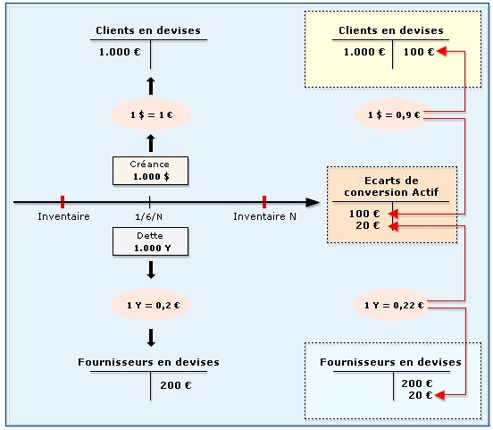 Soit une créance de 1.000 $ née le 1/10/N (taux de change 1$ = 1€), et un emprunt fait en Yen pour un montant de 10.000 Y (taux de change 1Y = 0,2€).