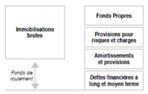 Le fonds de roulement représente la confrontation des ressources stables –capitaux propres et dettes à long et moyen terme – avec les emplois stables – les immobilisations brutes -.