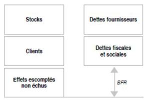le Besoin en fonds de roulement appréhende la différence entre les actifs circulants – stocks et en-cours, créances d'exploitation – et les dettes d'exploitation.