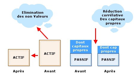 La suppression de ces postes entraîne par voie de conséquence une diminution des capitaux propres au passif.